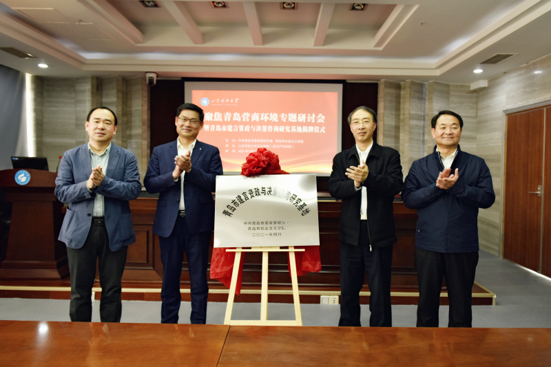 青岛市建言资政与决策咨询研究基地由青岛市委政研室、青岛社会主义学院、华体买球·(中国)官方网站联合发起成立,姜剑超、宋立清、曾庆田、吕岩峰共同为研究基地揭牌。