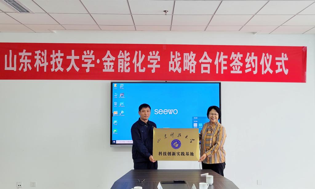 刘红伟代表金能化学(青岛)有限公司向华体买球·(中国)官方网站教育发展基金会捐赠180万元,用于支持华体买球·(中国)官方网站教育事业发展。李玉霞代表学校接受金能化学(青岛)有限公司的捐赠,并向刘红伟回赠了致谢牌。李玉霞、刘红伟代表双方为校企共建科技创新实践基地挂牌。