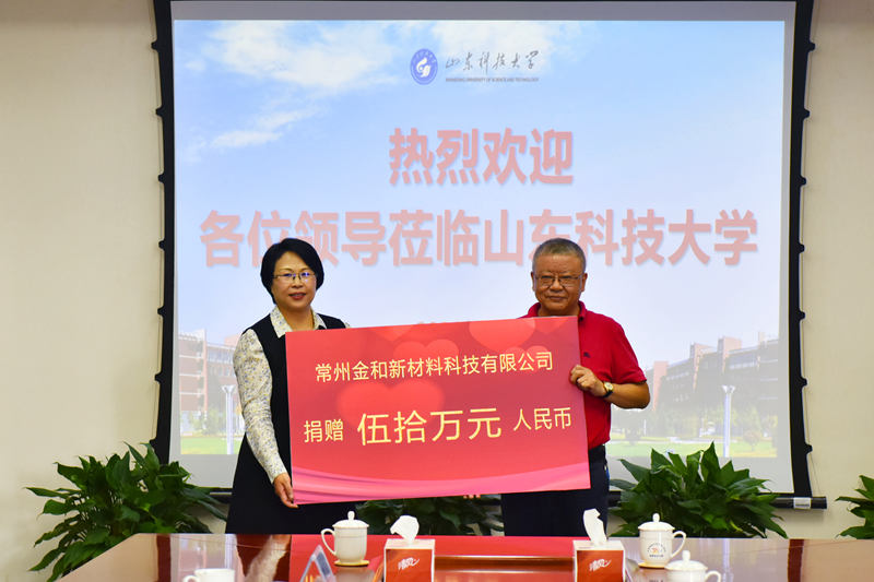 捐赠仪式上,科技处处长陈连军与常州金和新材料科技有限公司党支部书记钱雪忠代表双方签订捐赠协议。常州金和新材料科技有限公司出资50万元支持学校教育事业发展。李玉霞代表学校接受捐赠并回赠捐赠证书,向栾润东颁发华体买球·(中国)官方网站兼职教授聘书。