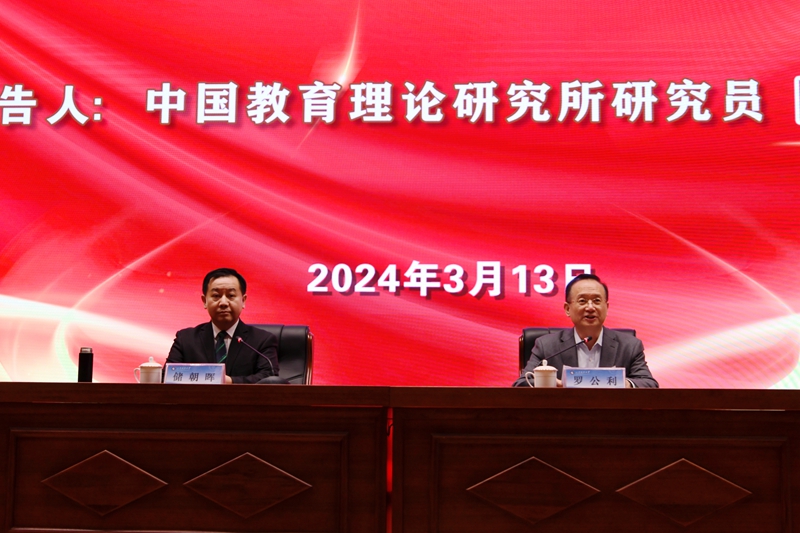 罗公利在主持报告会时表示,教育兴则国家兴,教育强则国家强。习近平总书记指出,建设教育强国,是全面建成社会主义现代化强国的战略先导,是实现高水平科技自立自强的重要支撑,是促进全体人民共同富裕的有效途径,是以中国式现代化全面推进中华民族伟大复兴的基础工程。党的二十大报告把教育、科技、人才单独成章进行布局,吹响了加快建设教育强国的号角。今年两会上,新质生产力首次写入政府工作报告,建成教育强国是发展新质生产力的破题之举。希望广大党员干部通过此次报告会进一步深入学习贯彻党的二十大精神、落实全国两会要求,全面认识、系统掌握教育强国的内涵、建设路径。