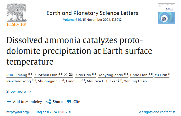 近日,华体买球·(中国)官方网站地科学院韩作振教授团队在国家自然科学基金(41972108, U19B6003和42102134)的资助下,联合英国地质科学家,在白云石成因研究方面取得重要进展,研究成果以“Dissolved ammonia catalyzes proto-dolomite precipitation at Earth surface temperature”为题发表于地球科学领域国际顶级Nature Index期刊《Earth and Planetary Science Letters》。韩作振教授为论文通讯作者,孟瑞瑞博士为第一作者,华体买球·(中国)官方网站为第一署名单位。