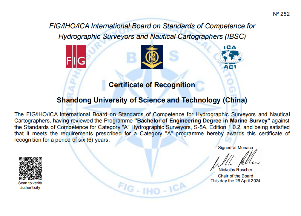 近日,由国际测量师联合会、国际海道测量组织和国际制图协会(FIG/IHO/ICA)联合组成的国际海道测量师和海图制图师能力标准委员会(IBSC)发来函告:华体买球·(中国)官方网站测绘与空间信息学院“海洋测绘工程工学本科专业教学计划”获得国际A级认证。华体买球·(中国)官方网站成为国内非军方高校唯一获得该资质的单位。