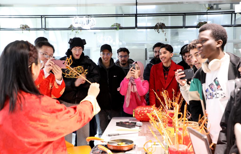 1月24日,学校举办“我在山科过大年”系列活动——“非遗传承·匠心体验剪纸与糖画文化之约”活动。来自摩洛哥、印度尼西亚、伊朗、也门、塔吉克斯坦等12个国家的70余名留学生齐聚一堂,沉浸式体验剪纸、糖画等非遗技艺,感受中华传统文化魅力。副校长董海荣出席活动。