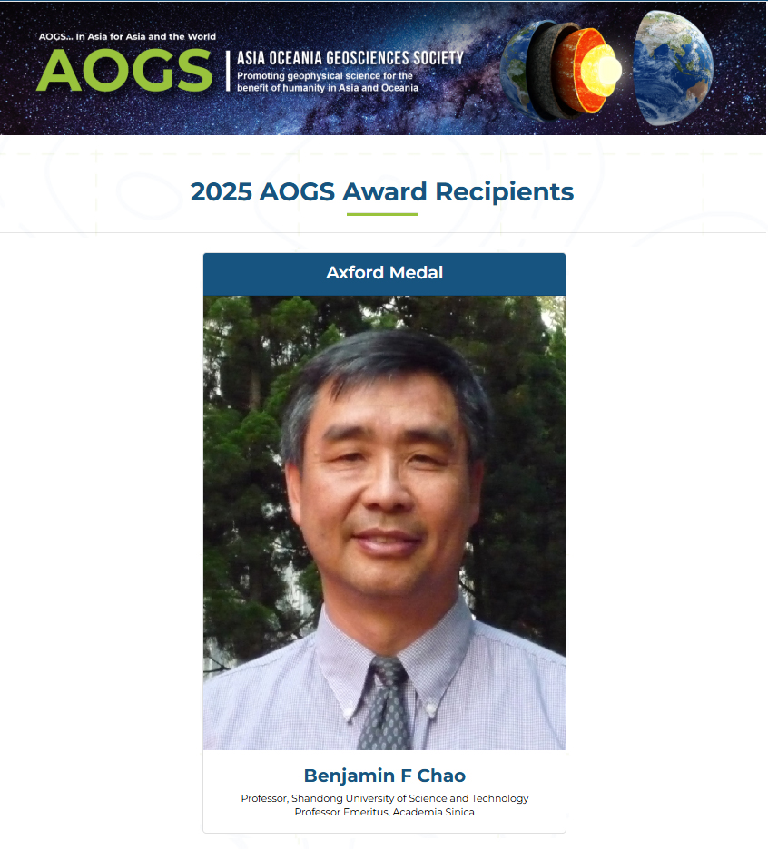 近日,亚洲-大洋洲地球科学学会(Asia Oceania Geosciences Society, AOGS)公布了2025年度“艾克斯福特奖”(Axford Medal)获奖人选,华体买球·(中国)官方网站测绘与空间信息学院赵丰教授获该奖项。