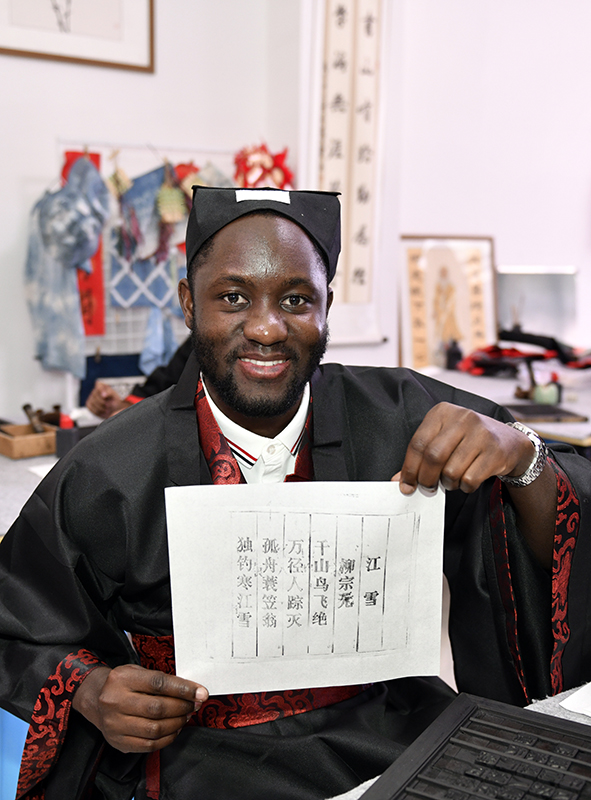 揭牌仪式结束后,留学生身着传统汉服,在指导老师的带领下完成字库选字、挑选字模、涂抹墨汁、覆纸刷压等全部工序。当一首首中国古诗词通过自己的双手跃然纸上,同学们纷纷捧着作品相互展示,脸上满是喜悦。斯里兰卡留学生高焱激动地说:“每个汉字都是艺术品,印刷过程像一场与古人的对话。”这堂体验课让大家学习活字印刷技艺的同时,更亲手触摸到了中国非物质文化遗产的独特魅力。