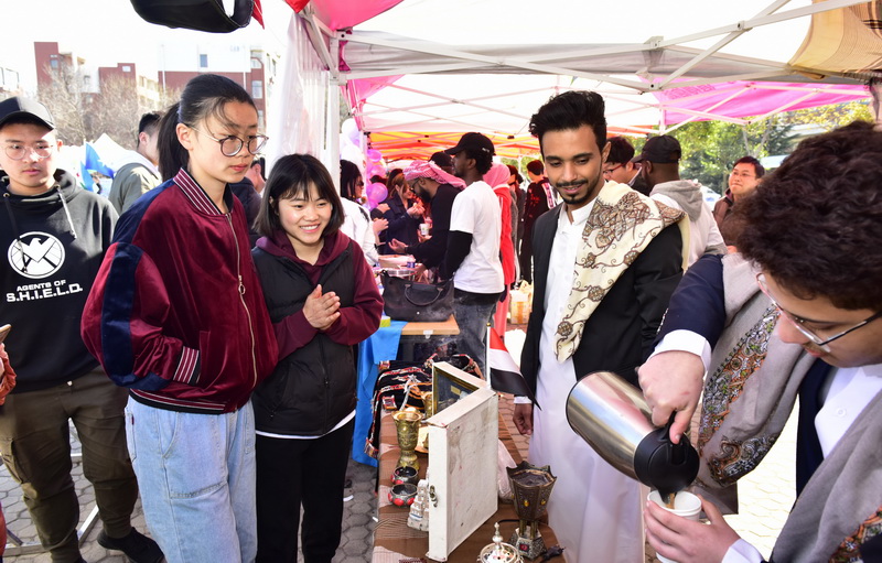 开幕式后,近千名中外大学生参加了艺术节异域风情游园活动。日本、德国、新加坡、法国、荷兰等国家的特色风俗文化以多种趣味形式大放异彩。现场,中外大学生身着各具特色的异域服装,设置了具有各国特色的丰富知识和趣味游戏,还精心准备了各国的美食,让“游客”品尝美食,观赏摆件,感受具有异域风情的舞蹈,通过参与互动,师生在美食和游戏中感受文化的融通。
