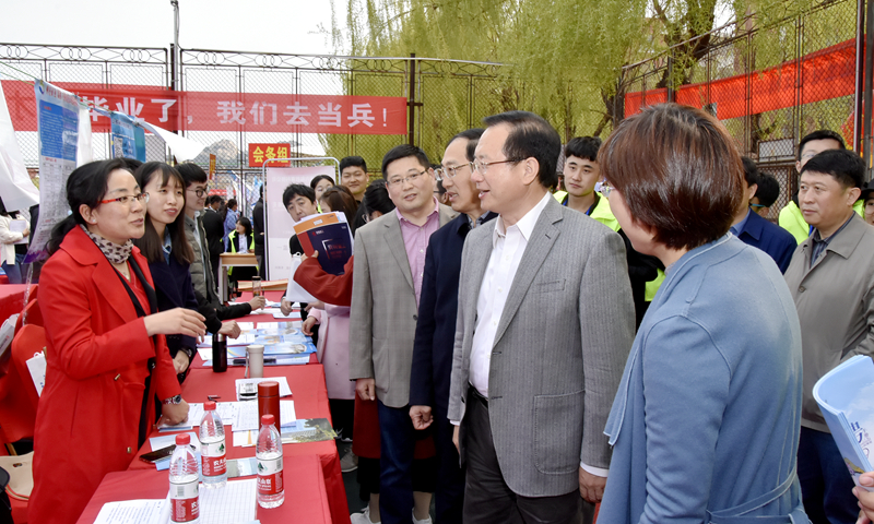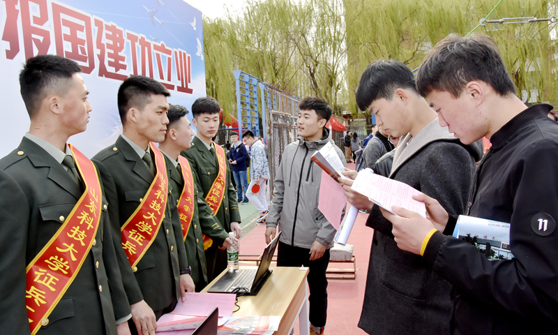 现场除了各家企业之外,大学生征兵服务站成了一道靓丽的风景线。“当兵也是一种职业,保家卫国建功立业。”学生处李雷介绍,“招聘会专门设置了征兵服务站区,由退伍大学生向毕业生及各年级同学介绍征兵入伍政策、鼓励吸引大学生入伍建功立业。”