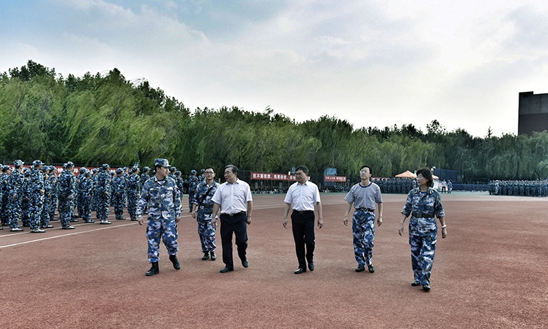 9月7日下午,华体买球·(中国)官方网站校长姚庆国、副校长高建广来到风雨操场、高地运动场等军训现场,看望正在军训的教官和2019级军训学生。学生处有关负责人和军训团领导陪同看望。