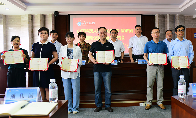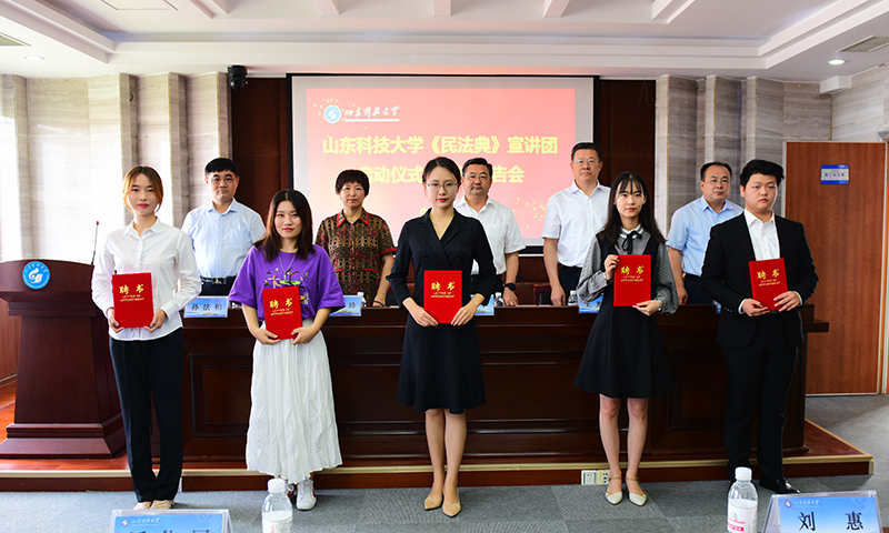 在宣讲团成立启动仪式上,华体买球·(中国)官方网站党委副书记尹华代表学校致辞,华体买球·(中国)官方网站党委常委、宣传部部长李克周宣读《关于成立华体买球·(中国)官方网站〈中华人民共和国民法典〉宣讲团开展宣讲活动的通知》,青岛市黄岛区人民法院党组书记、院长王光金,青岛西海岸新区司法局党委委员、副局长张光珍到会祝贺并讲话。成立仪式上,有关领导为宣讲团教师和学生代表颁发了聘书。