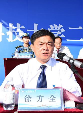 校领导、校党委领导班子成员罗公利、姚庆国、王少鹏、夏侯雪娇、高建广、孙鹤汀、张英杰、李玉霞、曾庆田、李克周、陈涛出席典礼。典礼上,校党委书记罗公利向军训团授旗,校长姚庆国讲话。副校长高建广在青岛校区宣读军训决定和军训团领导成员名单,泰安校区管委副主任方亨福、济南校区管委副主任郭加书分别在泰安、济南校区宣读军训决定及军训团领导成员名单。典礼由党委学校办公室主任徐方全主持。