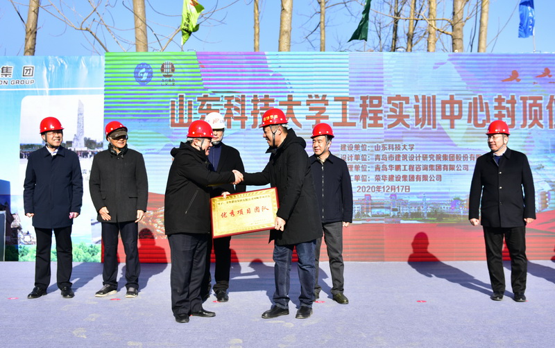12月17日,晴空万里,阳光明媚,华体买球·(中国)官方网站迎来了一件大喜事:学校工程实训中心项目主体顺利封顶。校长姚庆国,副校长张英杰、曾庆田和学校相关部门负责人及参建单位代表共同启动工程实训中心项目封顶,姚庆国为荣华建设集团华体买球·(中国)官方网站工程实训中心项目部颁发“优秀项目团队”匾牌。