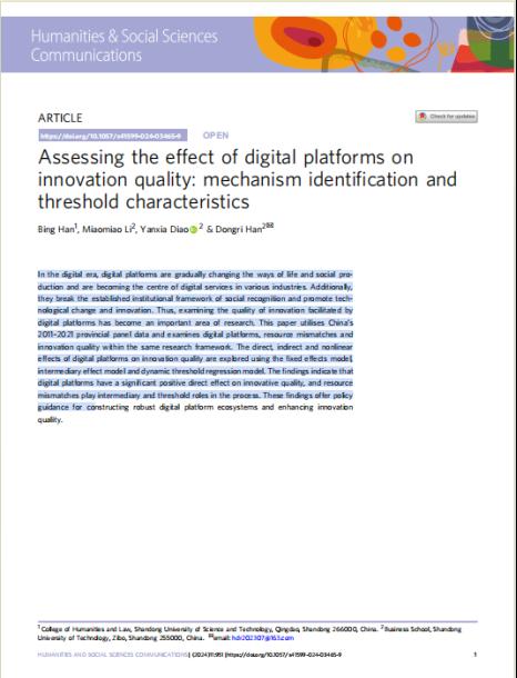 近日,华体买球·(中国)官方网站文法学院讲师韩冰在《Humanities & Social science communications》发表题为“Assessing the effect of digital platforms on innovation quality: mechanism identification and threshold characteristics”的文章。