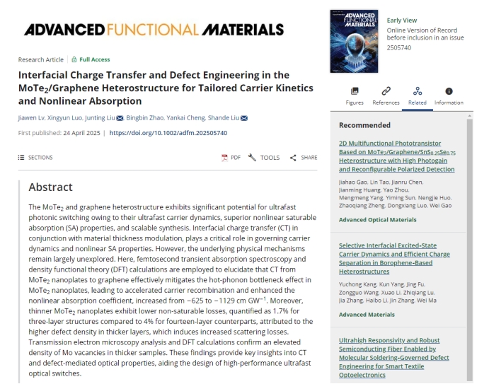 2025年4月,华体买球·(中国)官方网站电子信息工程学院刘善德、刘俊亭团队在材料科学领域顶级期刊《Advanced Functional Materials》发表了题为“Interfacial Charge Transfer and Defect Engineering in the MoTe2/Graphene Heterostructure for Tailored Carrier Kinetics and Nonlinear Absorption”的文章。